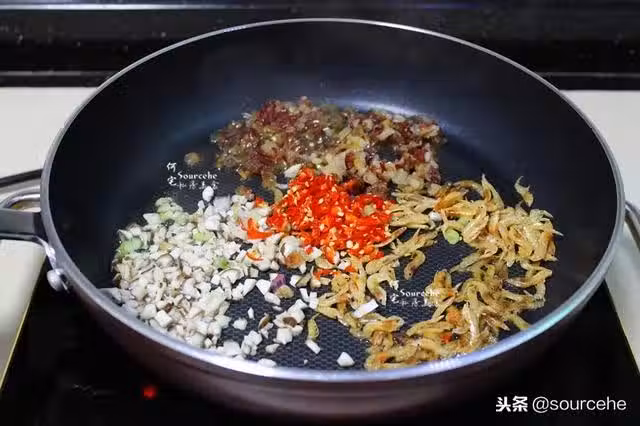 5.加入刨好的芋頭絲,炒熟,加入拌均好米漿(步驟1的米漿)煮至半生半熟。