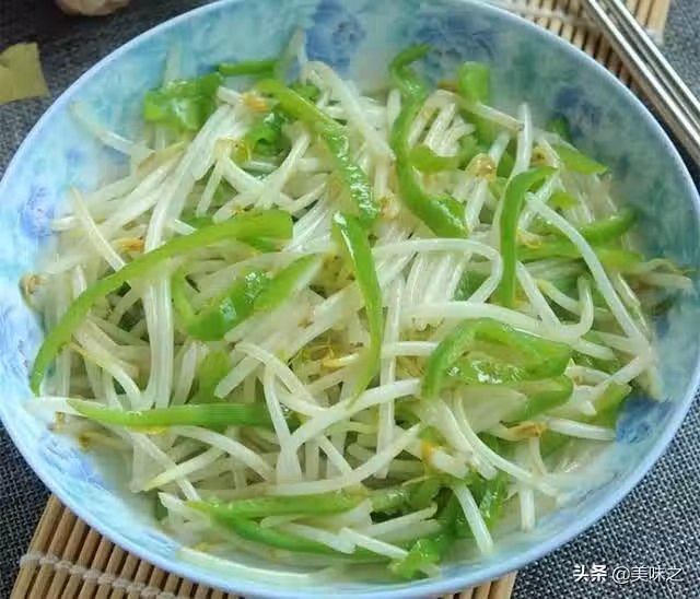 綠豆芽300g、青椒2隻、油適量、鹽適量、味精適量。