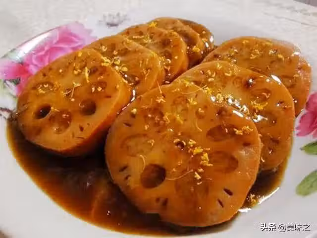 6、煮好後,自然放涼,切片用煮藕的水加桂花醬和水澱粉做成欠汁澆上就可以吃了。