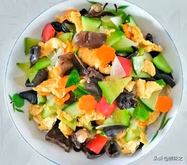 4、平底鍋加熱加點油炒香洋蔥,胡蘿蔔,紅椒,然後加木耳,加黃瓜,加五香粉,加鹽,最後加上煎好的雞蛋,翻炒均勻就可以了。
