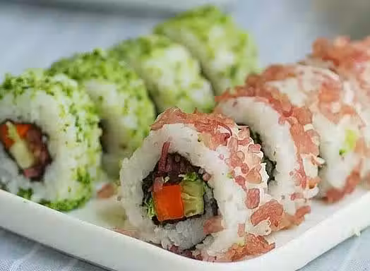 7、內卷:海苔上鋪一層米飯,放上胡蘿卜黃瓜,西蘭花碎、血珊瑚草捲起即可(吃的時候蘸壽司醬油)