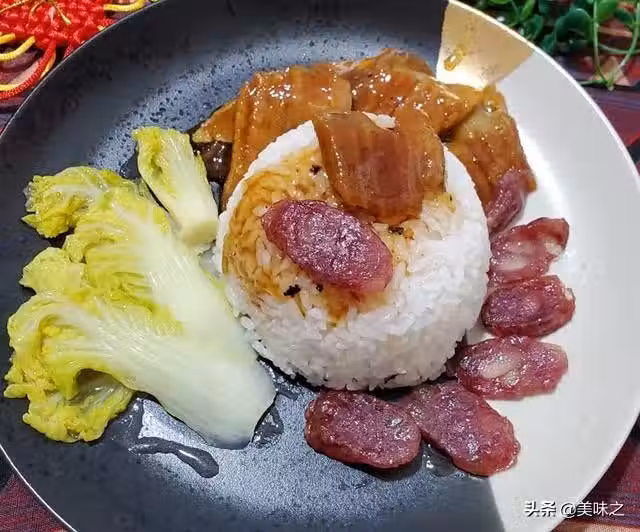 3、食材加熱後把飯倒扣在大盤子中,再把鰻魚和臘腸擺在旁邊,隨意擺即可,午餐剛好有炒白菜,挑了幾條,擺在旁邊,這樣葷素搭配。