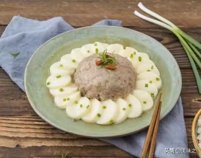 3、把玉子豆腐切成小圓片,圍繞在盤子的邊緣。將肉餡先團一團整整形,再按扁收口,倒扣在玉子豆腐中間。
