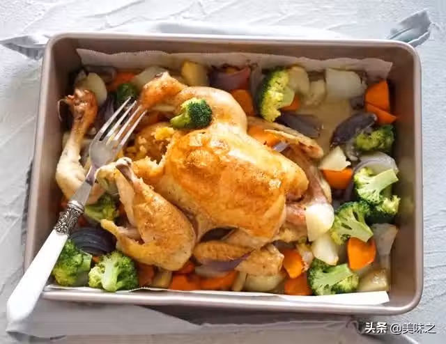5、雞和除西蘭花以外食材放入烤盤內,放入烤箱。