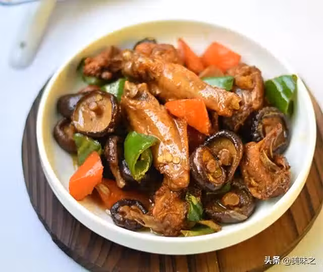 雞半隻、胡蘿蔔1個、青椒1個、生抽1湯匙、料酒1茶匙、干香菇25g、姜3g、蒜2瓣、老抽1茶匙、鹽少許。