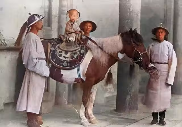 宮殿里,一個太監牽著馬,另外兩個太監看守著。馬背上坐著一個孩子,他就是愛新覺羅·溥儀。一兩歲的溥儀坐在馬鞍上,牽著韁繩在太監的照顧下拍照。