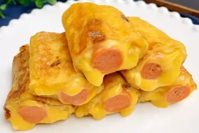 (2)吐司均勻地塗一層雞蛋液,鋪一片芝士,再放入火腿腸將其捲起來。
