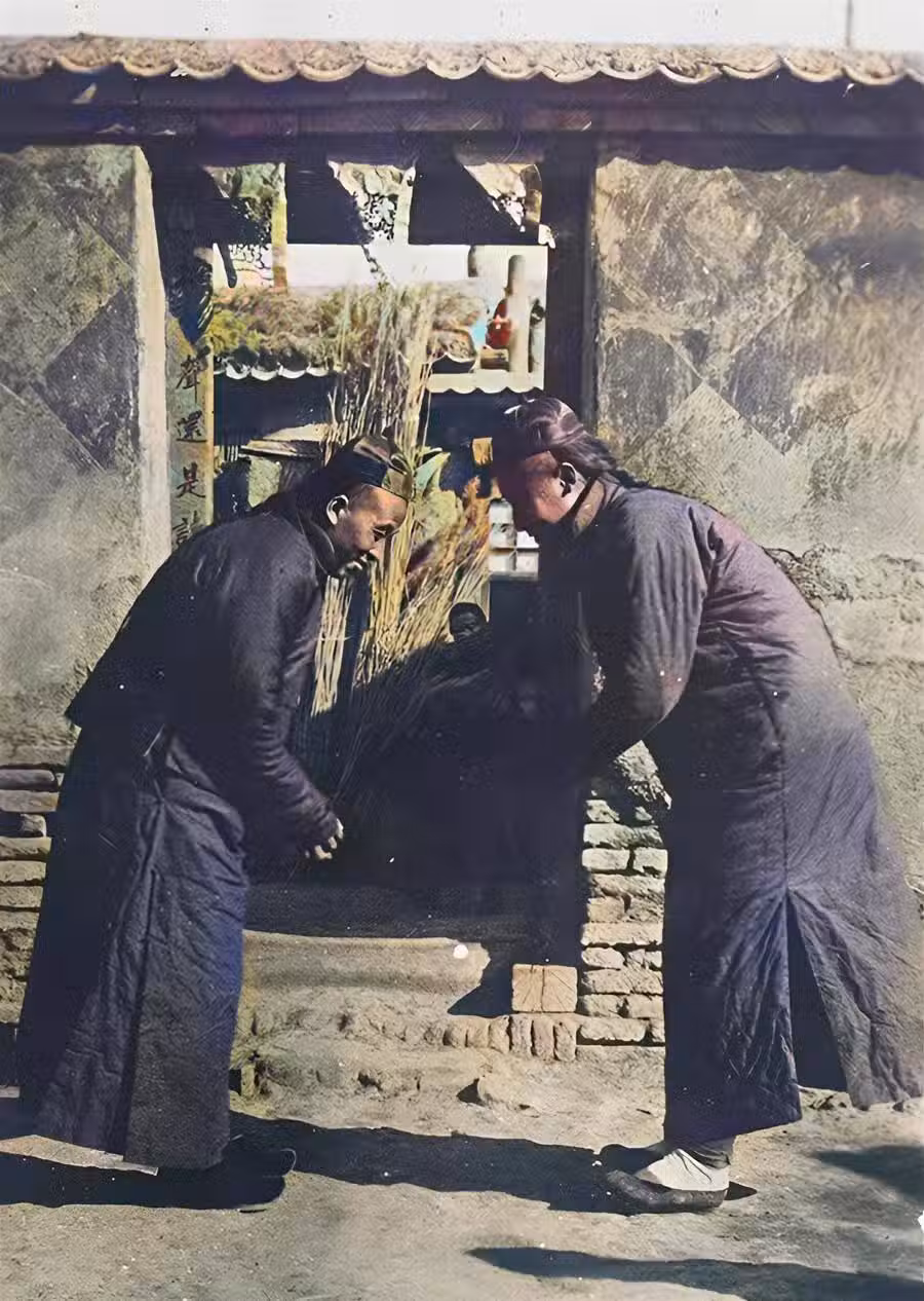 清朝時期的北京,兩名男子在家門口偶遇,立即面對面作揖。施禮時需兩手抱掌前推,身子略彎,上身前傾45度。因此,作揖是很講究的。