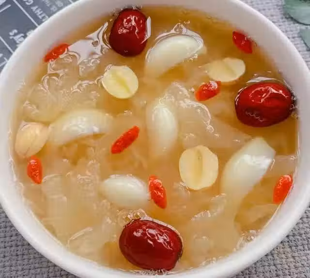 (1)百合掰成瓣,銀耳放入碗中加入適量清水浸泡變軟去蒂切塊,蓮子浸泡片刻,大紅棗洗凈表麵灰塵備用。
