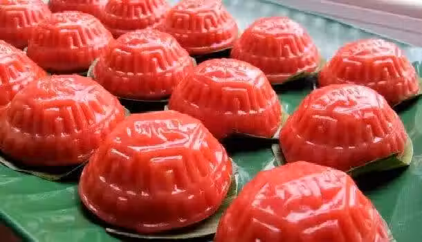 4、放入已抹粉的木模里,輕輕壓平,扣出,放在抹了油的香蕉葉上。