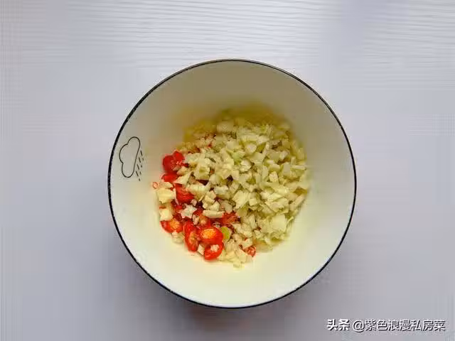 4.將大蒜切末,小米椒切圈,放入碗中,再潑上熱油 激發出大蒜的香味。