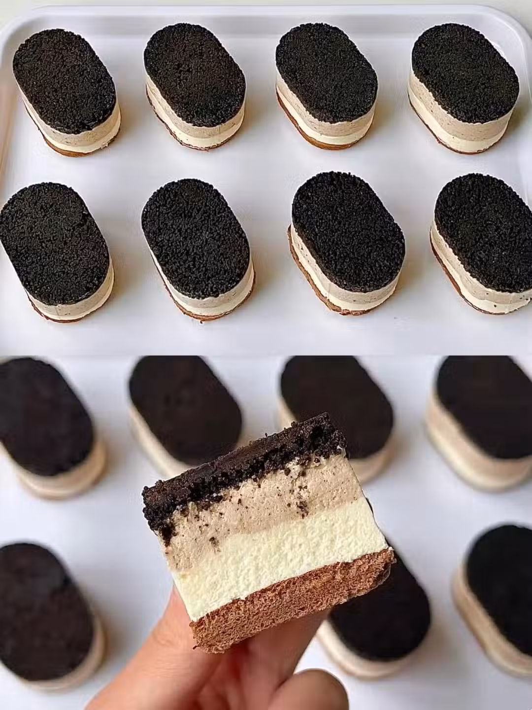 ⑤奶酪糊平均分成兩份,一份加入20克巧克力醬和10克奧利奧碎攪拌均勻,分別裝入裱花袋中,先擠一層巧克力奶酪糊,放冰箱冷藏10分鐘後取出,再擠上原味奶酪糊,放上蛋糕片放冰箱冷藏至凝固就可以脫模食用啦~