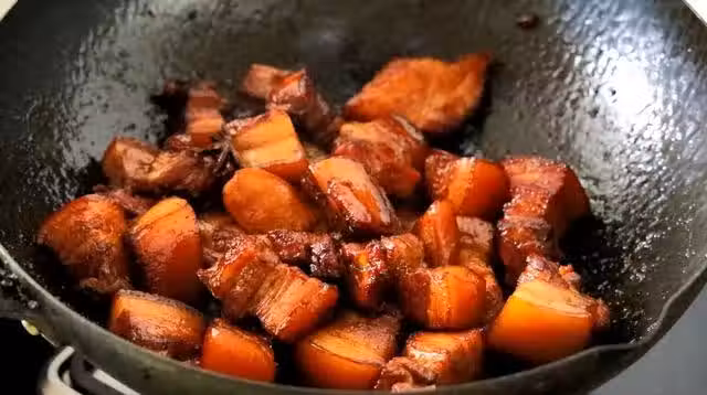 7、加入沒過五花肉的開水,轉移到砂鍋里,放幾根小蔥,小火慢慢燉1個小時左右;