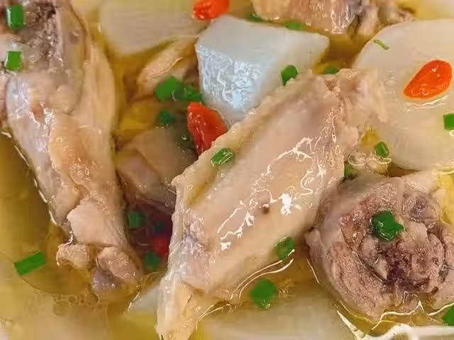 2、將雞肉、白蘿蔔和薑片放入鍋中,放入適量的清水,煮開後轉小火燉煮一個小時即可。燉煮至白蘿蔔變軟,撒上枸杞子,加入食鹽調味,再煮五分鐘煮至入味即可出鍋開吃。