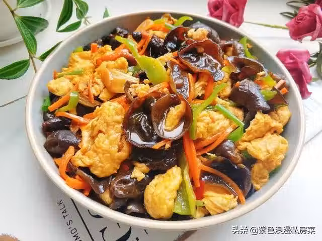 5.倒入木耳,胡蘿蔔絲翻炒,放雞蛋,青椒翻炒,炒勻後即可出鍋。
