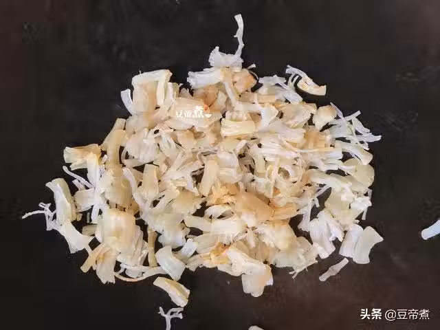 4、提前數個小時泡發乾貝,使用中小火干鍋煸鏟一會。煸鏟至乾貝炒散,並且能聞到香味再盛出備用。