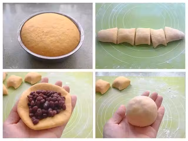 ④、包好的蜜豆包,用手輕輕壓扁,平底鍋小火燒熱,將做好的蜜豆餅放進鍋中,小火烙制兩位微微發黃就可以了。