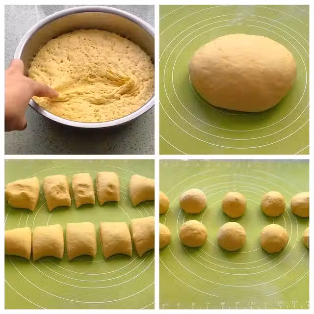 ④、將每個麵糰都搓成較粗的長條,然後各等分成4個小劑子,分別將它們擀成薄厚適中的麵皮,取五張面片,一半壓一半地擺在一起,然後從左面往右面一點一點地捲起,然後用刀從中間切開,分別豎起來後再整理一下花瓣就可以了。
