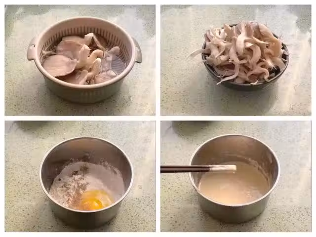 ②、將處理好的蘑菇倒入麵糊中,讓蘑菇均勻地裹上面糊。鍋內加油油熱五成時,下入蘑菇炸至凝固微微有一點變色,就可以撈出來瀝油,接下來將剩餘的蘑菇再放入鍋中炸好撈出。最後再將所有炸好的蘑菇倒入油中復炸一遍,再撈出來瀝油。——(①、檢測油溫是否是五成熱,可以使用一根筷子放進油中,筷子周圍冒出細細的小泡泡,就可以放入炸了。②、建議將炸好的蘑菇放在吸油紙上,這樣油脂會少一些。)