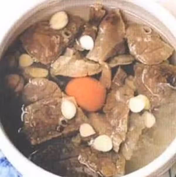 將豬肺沖洗乾淨切塊,再與洗凈的桑葉、杏仁放入燉盅內,加水300ml,隔水燉2小時即成。