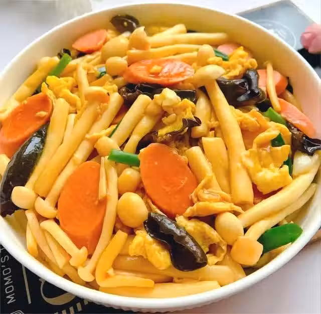 步驟三:鍋中留底油,把白玉菇和黑木耳下鍋炒一下,放入火腿片,加一勺生抽、一勺蚝油、少許鹽,翻炒均勻使其入味,最後放入雞蛋、蔥段,翻炒均勻即可出鍋。