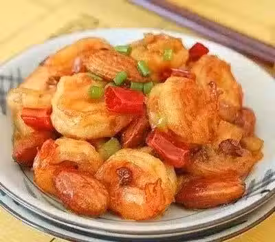 食材:大蝦、大杏仁、蔥、姜、蒜、干辣椒、花椒、鹽、白糖、料酒、醋、香油、澱粉、水、食用油