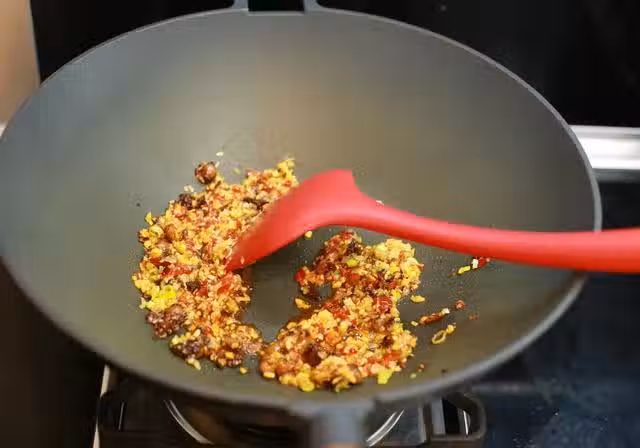 5、加入肉末翻炒,一邊炒一邊煎肉末弄散,儘量少結團,多炒一會,將肉末里的肥肉部分炒出油分。