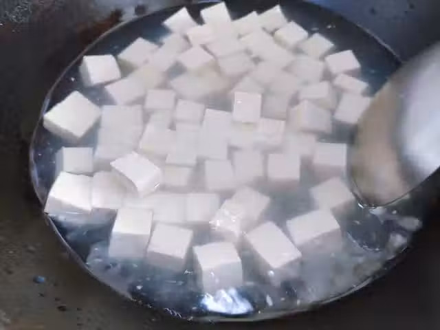 2. 鐵鍋中加適量清水,加入1勺鹽,倒入剛才切好的豆腐塊,中小火汆水1分鐘左右。汆水的過程中要用勺子攪動水中的豆腐,攪動時要用勺子背兒推動水中的豆腐,不然勺子邊緣容易把豆腐割破。在水沸騰之前,把豆腐盛出,把豆腐瀝干水分備用。
