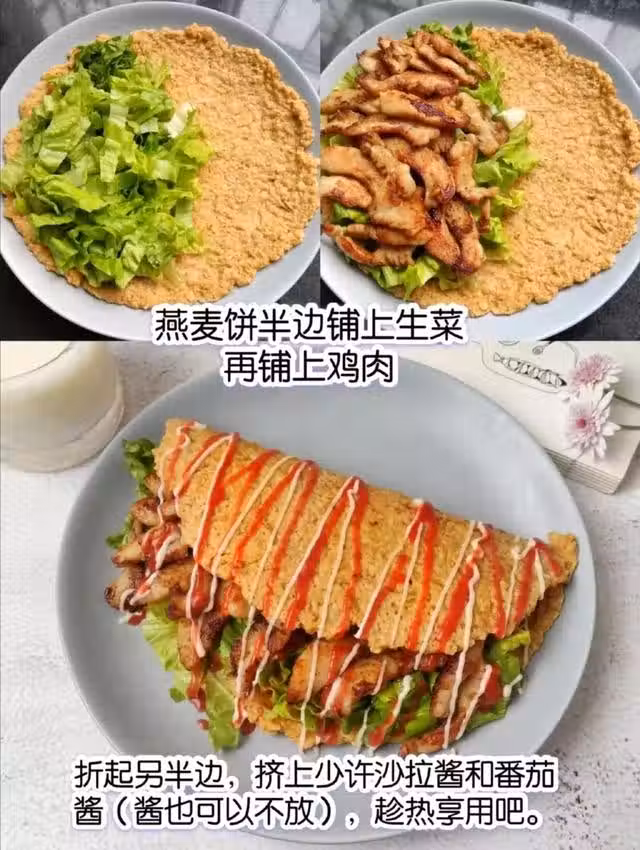 5燕麥餅半邊鋪上生菜,再鋪上雞肉,折起另半邊,擠上少許沙拉醬和番茄醬(醬可以不放),趁熱享用吧。