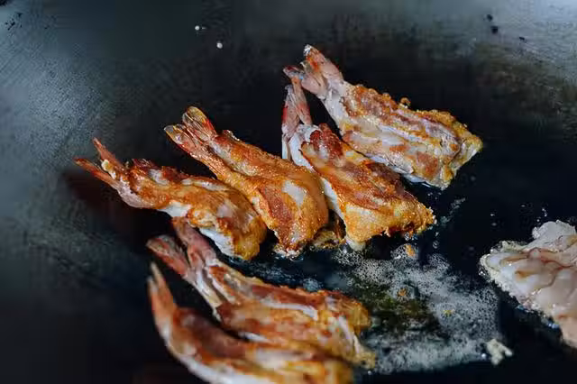 沾蛋液和蝦下鍋的時候一定要快一點,用最快的速度把所有的蝦放入到鍋中,放好之後按照當時的情況來調節火候,把蝦煎到熟透但是沒有燒焦的狀態,我大概煎了一分多鐘。