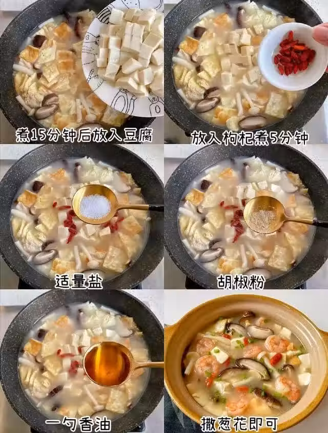 2、鍋里倒油炒香蔥姜,倒入蝦仁炒至變色,倒入菌菇和雞蛋,加入適量清水,倒入石解和麥冬煮15分鐘,煮好後倒入豆腐和枸杞煮5分鐘,放入適量鹽、胡椒粉、香油,撒適量蔥花即可。