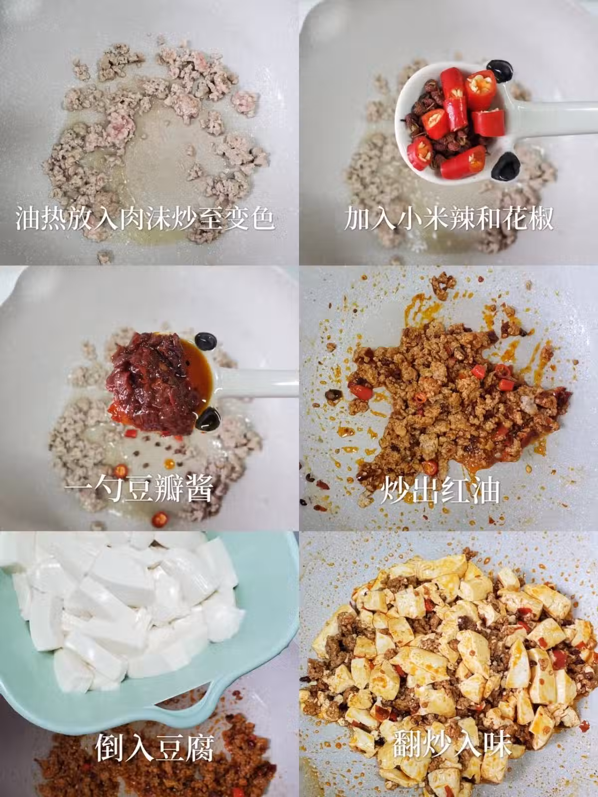 食材:豆腐,肉末,小米辣,花椒,蔥蒜,豆瓣醬等,步驟看第5-7張圖