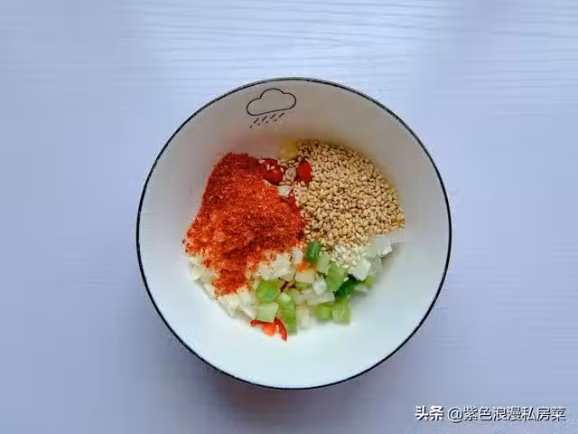 3.做一個萬能的涼拌汁,碗中放蒜末,小米椒,白芝麻,辣椒粉,潑上一勺熱油。
