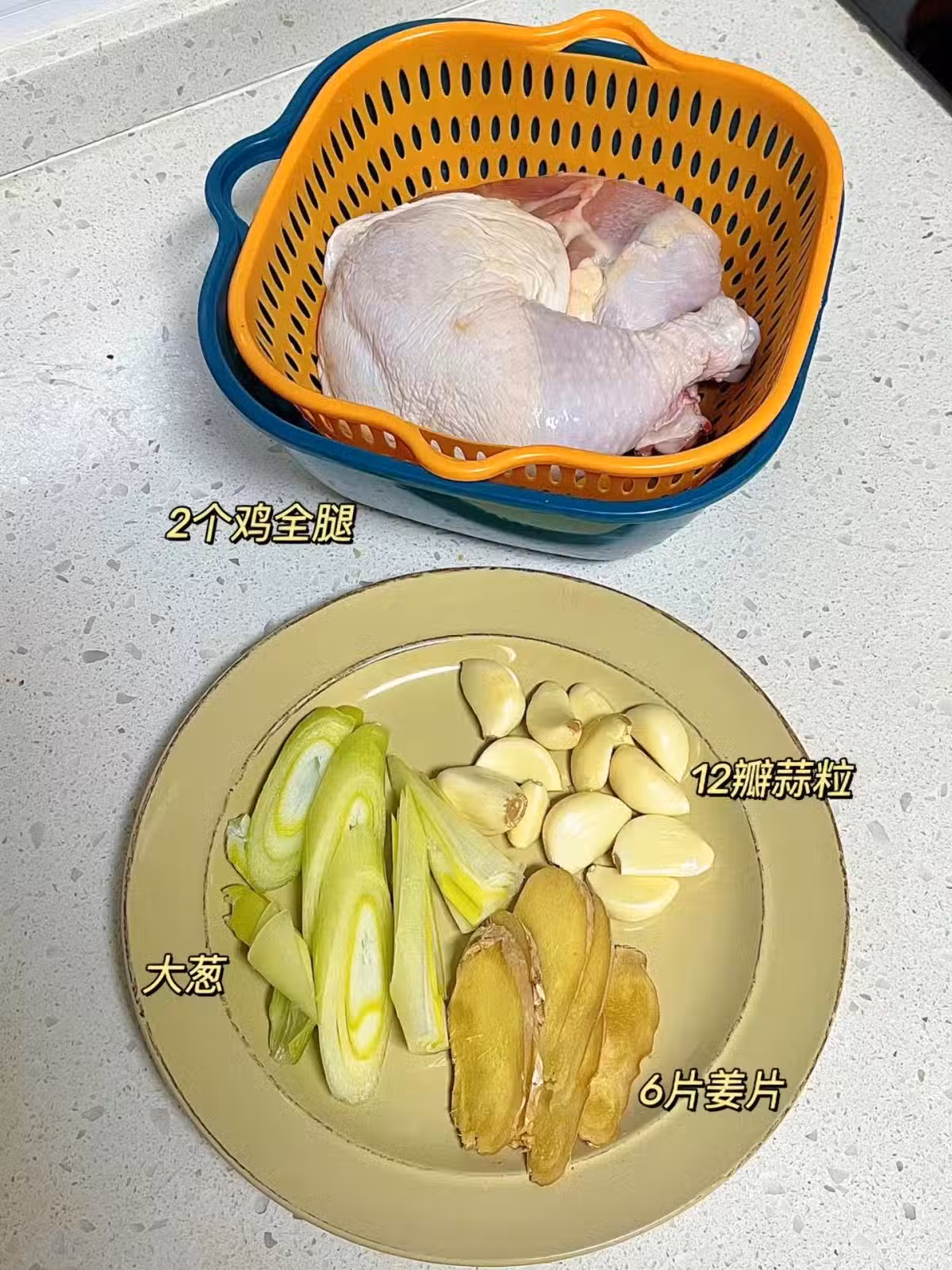 食材準備👉🏻:2個雞全腿,12瓣蒜粒,大蔥,薑片