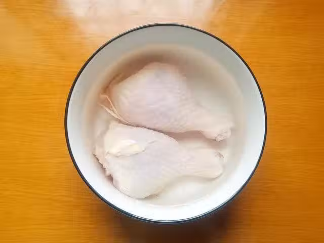 2、琵琶腿泡好後,倒去碗內的水,然後把2克薑黃粉均勻地塗抹在它的表皮上,塗抹薑黃粉是為了讓成品上色更好看,而且薑黃粉還有去腥增香的作用