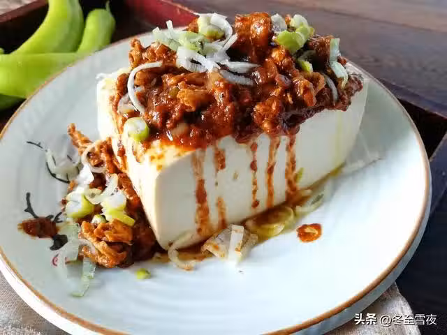 【雞蛋醬拌豆腐】所需材料:北豆腐1塊、雞蛋2個、黃豆醬3湯匙、油適量、蔥1段、