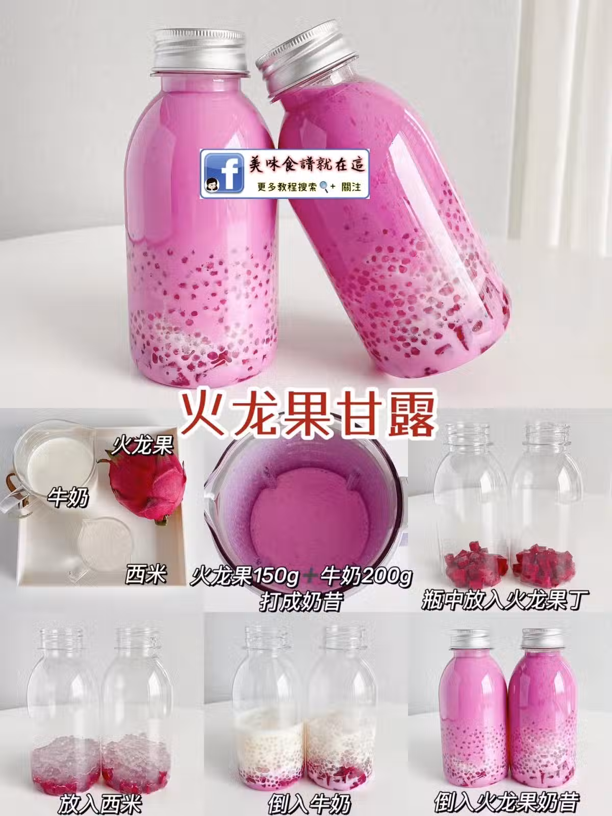 ▪️瓶中依次放入火龍果丁,西米,倒入火龍果奶昔