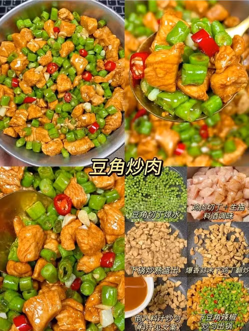 - 鍋中再放少許油,放入豆角和辣椒粉,翻炒均勻,然後再加入炒好的雞肉,翻炒均勻即可。
