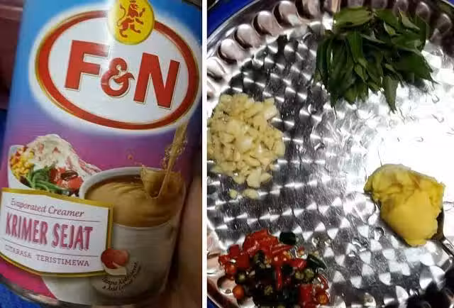 7. 爆香後,加入半罐淡奶,將淡奶煮開,然後,持續翻煮至粘稠