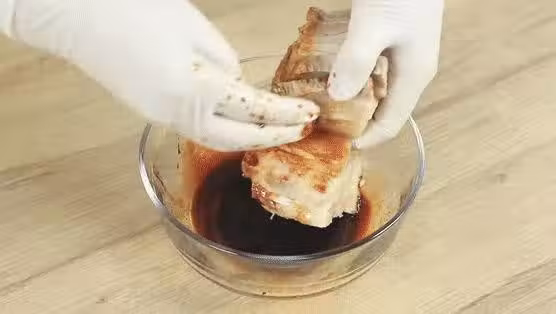 第四步:五花肉腌制好了之後取出來,然後用錫紙將五花肉包好,像圖中一樣嗎,再用叉子再最上面扎一些小孔,細密一點。