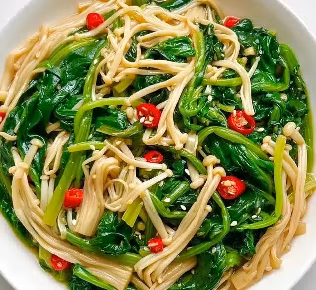 1.金針菇洗凈,去除根部,菠菜清洗乾淨,大蒜切末小米辣切圈。