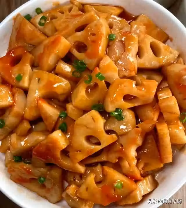 3.鍋中到油,倒入蒜末炒出香味,倒入藕丁,大火翻炒兩分鐘,再倒入糖醋汁,翻炒均勻後,湯汁粘稠,出鍋撒上小蔥花。