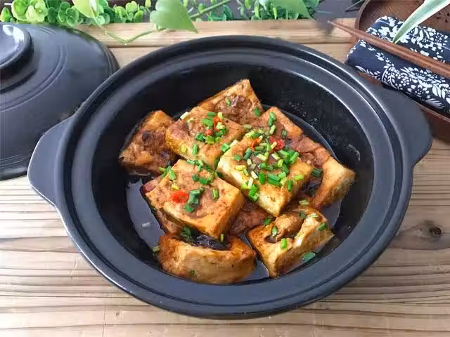 【材料】:北豆腐一塊,豬肉150克,生抽1勺,蚝油1勺,料酒適量,黃豆醬2勺,白砂糖適量,料酒適量,水澱粉適量,蔥適量,紅辣椒適量