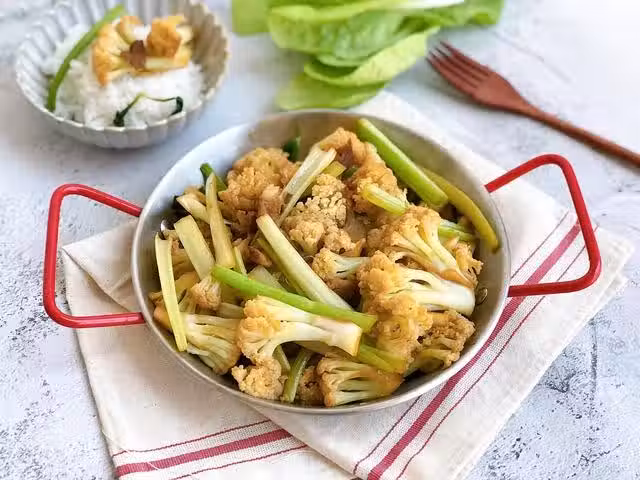 製作過程:1、我們先將花菜切成小朵,放入水中,加點鹽和麵粉攪拌充分混合溶解,加鹽可以起到殺菌作用,麵粉具有吸附作用,可以把花菜中粉塵和蟲卵清洗乾淨。2、鍋中水煮沸後,加點鹽和食用油,將花菜下鍋焯燙,焯燙至斷生撈起來,放入水龍頭中沖洗降溫,使花菜保持清脆口感。3、起鍋燒油,將花菜和芹菜下鍋,加點鹽、蚝油提味提鮮,再加點澱粉水勾芡一下即可出鍋裝盤。