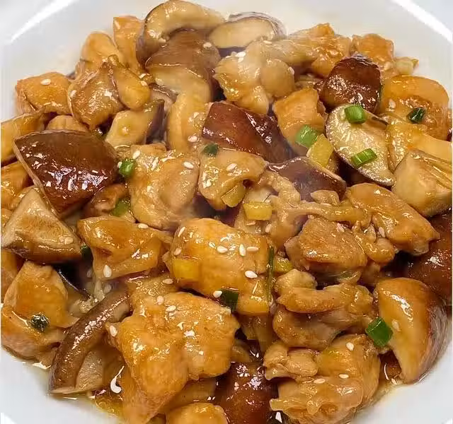3.鍋中倒油爆香蔥姜蒜,放入香菇翻炒變軟,再加入雞塊一起翻炒入味兒後,加入白芝麻出鍋裝盤。