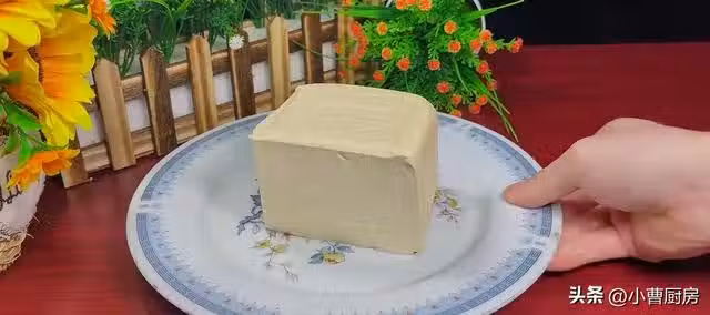 首先將5毛錢買回來的一塊嫩豆腐放到祖傳的菜板上,先用刀交叉著切兩刀切成大一點的三角塊,然後再用小刀將其劃成小一點的三角塊,稍微劃的厚一點不然嫩豆腐很容易碎,像這個樣子就可以了。