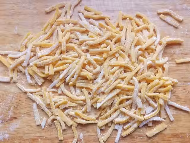 5、鍋內倒入小半鍋油,大火加熱到6成熱後,把麵條下鍋,炸到邊緣微微發黃後,要立馬關火,然後利用餘溫將它炸到上色均勻就可以出鍋了,下圖就是炸好的狀態,大家可以參考一下,千萬不要炸太久,炸的過程中也要用筷子多翻動,這樣可以讓它們受熱均勻些。溫馨提示,不要一次全部下鍋炸,因為麵條炸的時候會膨脹,建議大家分批炸制。