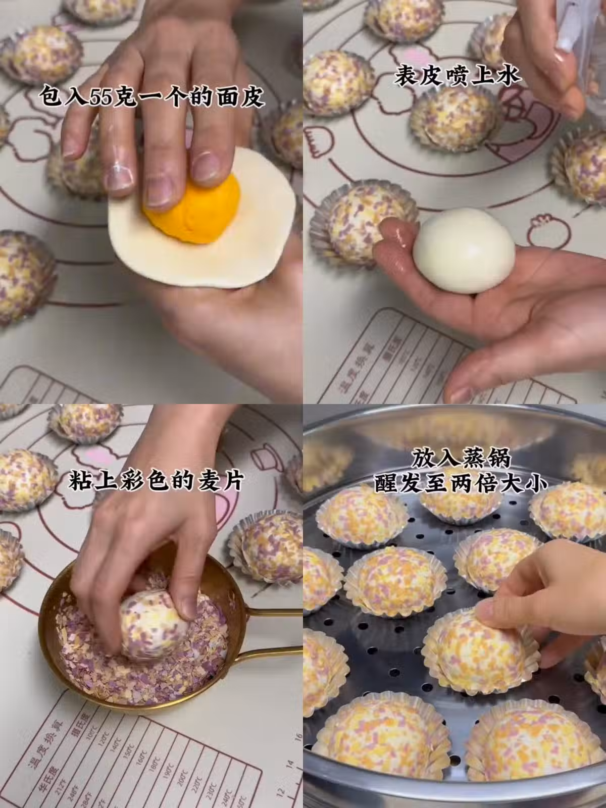 7️⃣表面噴上水,粘上彩色的麥片,放入蒸鍋醒發至兩倍大小
