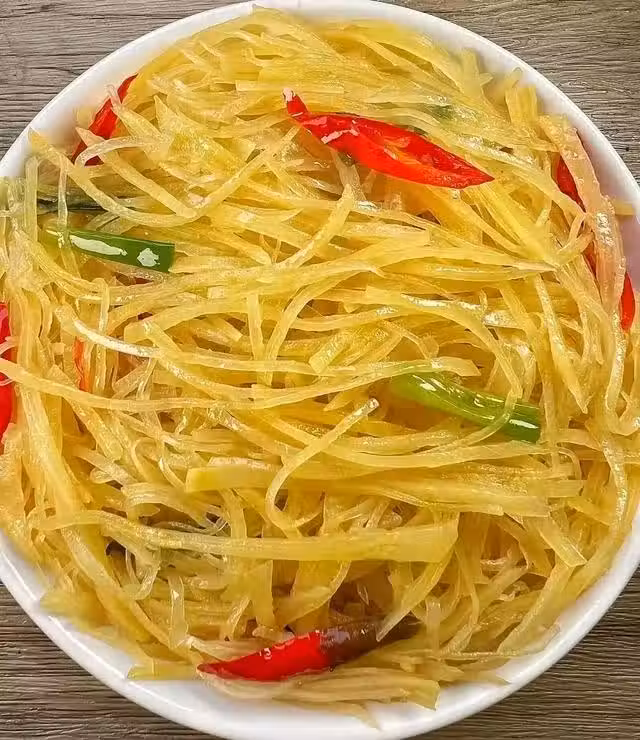 步驟三:鍋中油熱,下入干辣椒、蒜末炒香,再下入土豆絲,快速翻炒2分鐘,加少許蚝油、生抽、醋、鹽攪拌均勻,最後撒上蔥花段,攪拌均勻即可出鍋。
