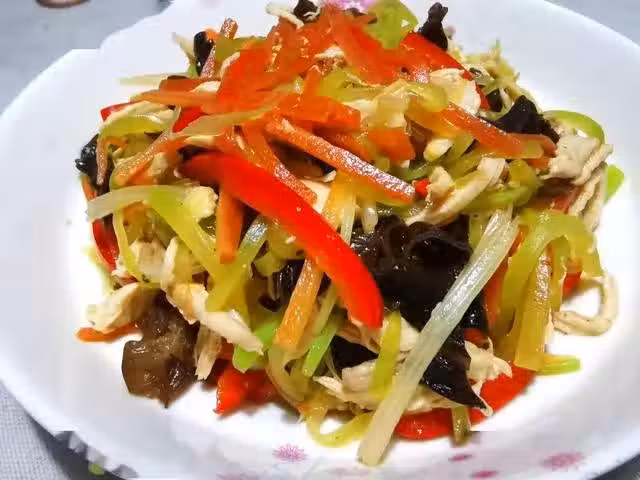 將煮熟的雞胸肉撕成絲狀備用。胡蘿蔔、黃瓜、紫甘藍等蔬菜切絲。鍋中加油燒熱後放入蔬菜絲翻炒片刻再加入雞絲繼續翻炒加鹽、胡椒粉調味炒勻後即可出鍋。這道菜色彩繽紛口感豐富非常適合夏天食用。